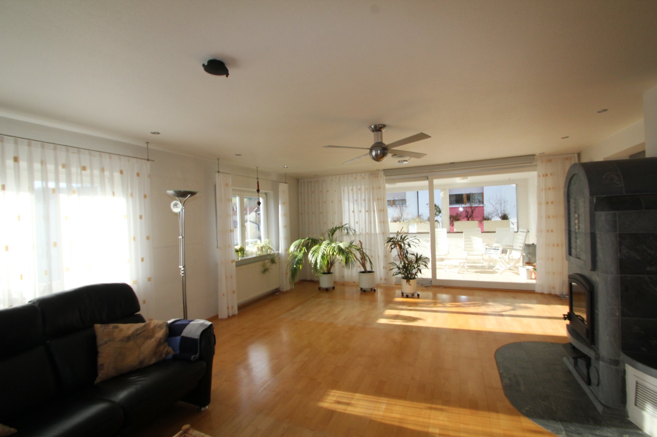 Ein hochwertiger Specksteinofen stellt den Mittelpunkt im Wohn- und Essbereich dar.