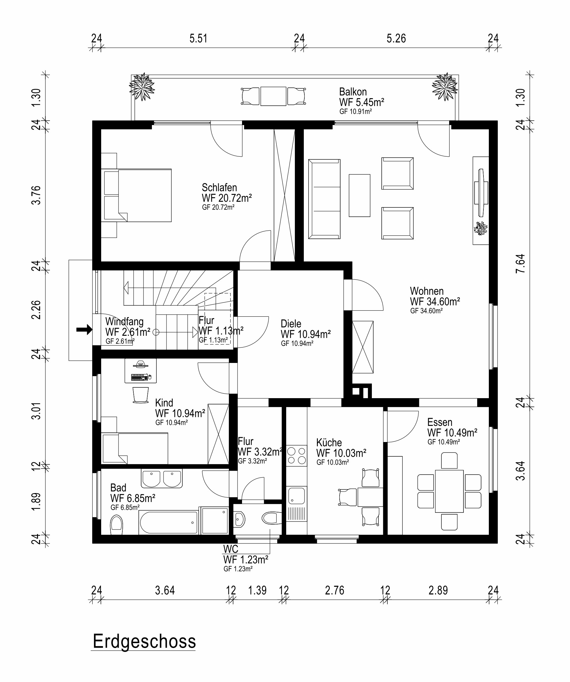 Sie betreten die Hauptwohnebene im Erdgeschoss mit ca. 118 m² Wohnfläche über eine großzügige Diele mit Zugang zu sämtlichen Räumen dieser Ebene. Das Raumangebot umfasst ein großes Schlafzimmer mit Balkonzugang, ein helles Wohnzimmer – ebenfalls mit Zugang zum Balkon –, ein separates Esszimmer, Küche, Kinderzimmer, ein Tageslichtbad mit Dusche und Badewanne sowie ein Gäste-WC. Durch die Größe des Wohnzimmers wird das separate Esszimmer nicht zwingend benötigt und könnte somit auch zur Vergrößerung der Küche dienen.