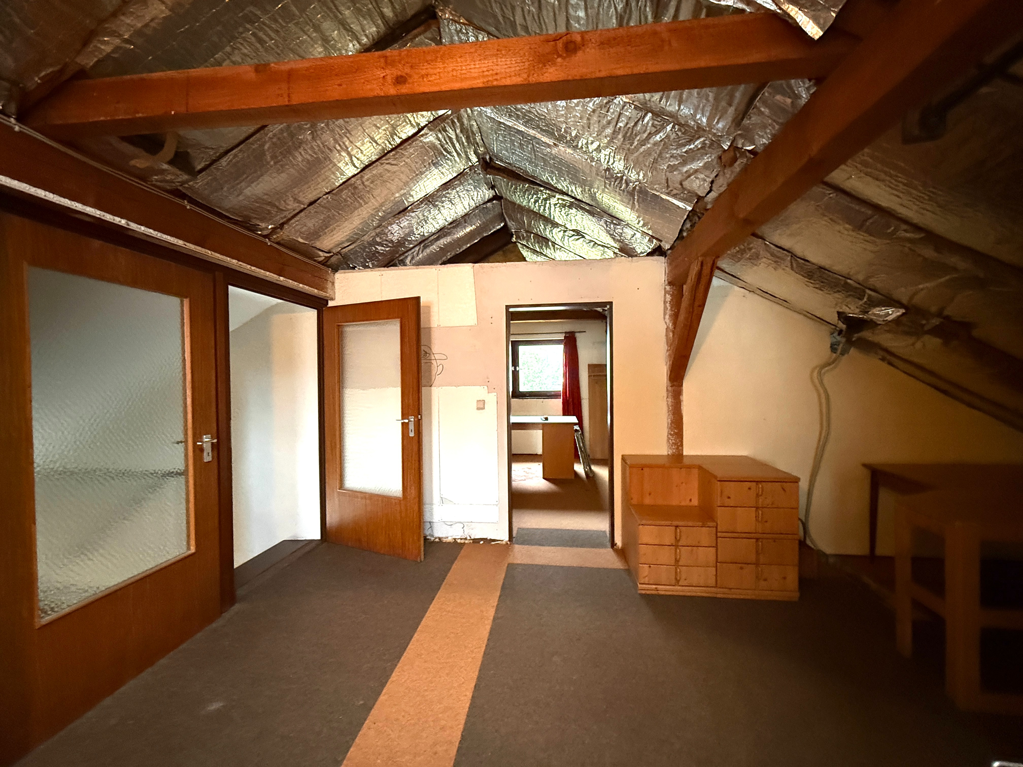 Das Dachgeschoss ist ebenso bequem über die reguläre Treppe erreichbar und wurde bereits für den Endausbau vorbereitet. Strom- und Heizungsleitungen sind vorhanden, die Dämmung wurde bereits eingebracht. Nach Abzug der Schrägen ergibt sich eine potenzielle Wohnfläche von ca. 67 m² – ideal zur Schaffung zusätzlicher Wohn- oder Arbeitsräume.