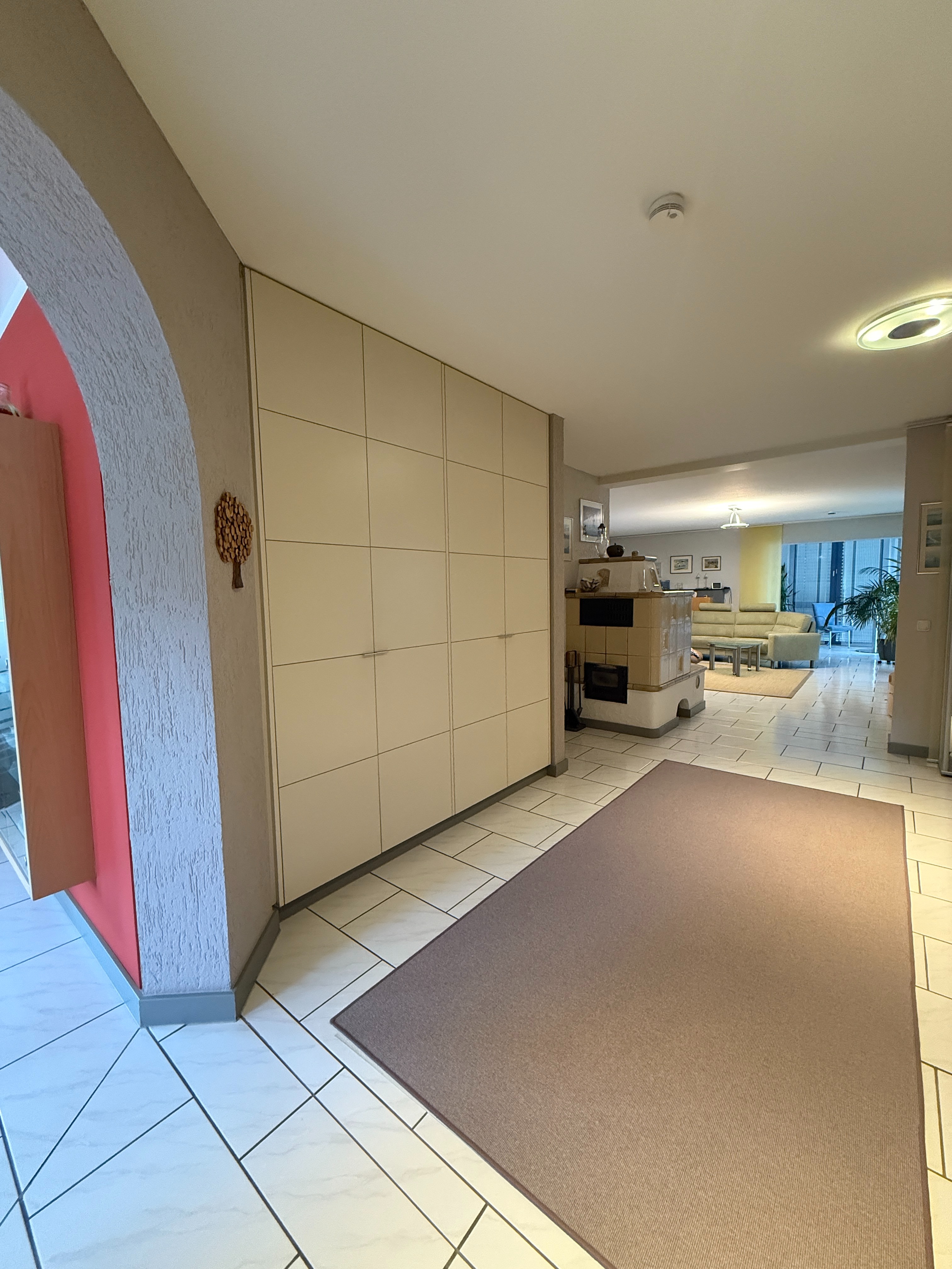 Sie betreten das Haus zunächst über 2 Stufen und erreichen das gemeinsame Treppenhaus. Die Wohnung selbst empfängt Sie mit einer großen Wohndiele mit einem Kachelofen als Mittelpunkt. Des weiteren sind hier praktische Einbauschränke untergebracht.