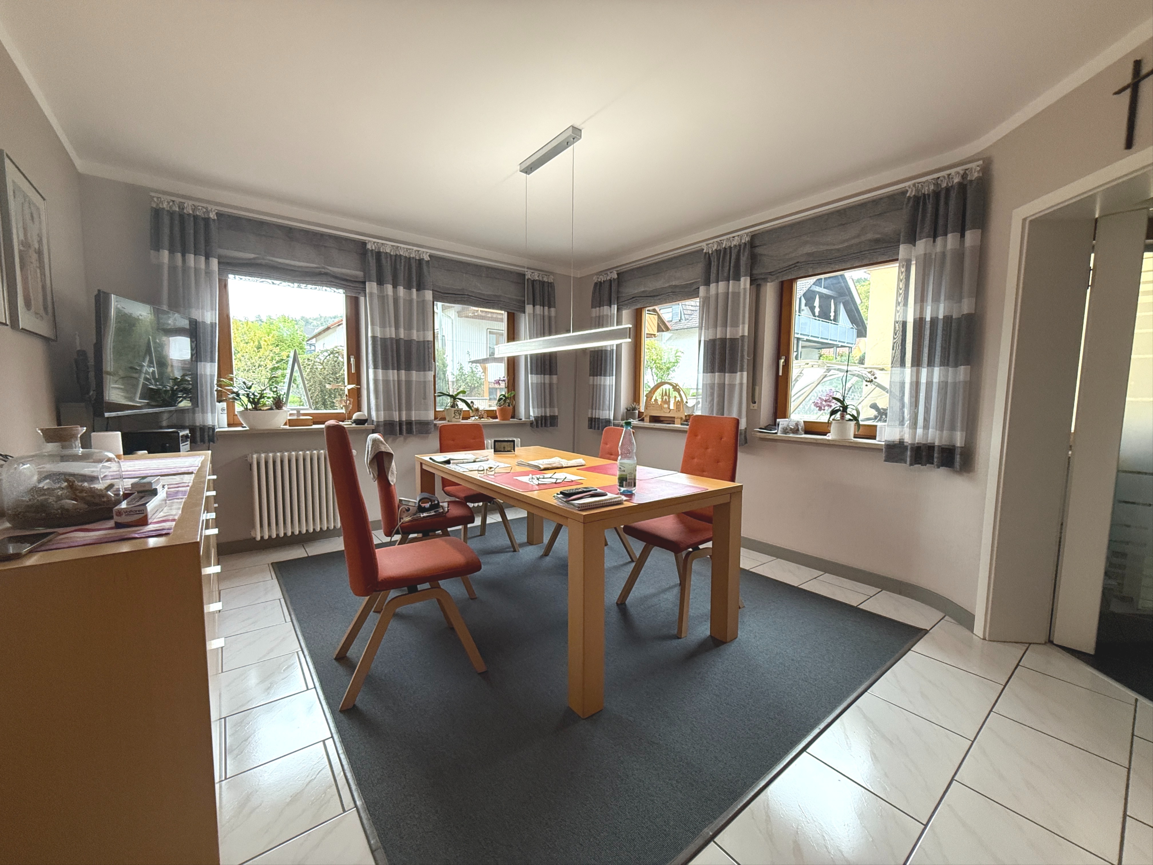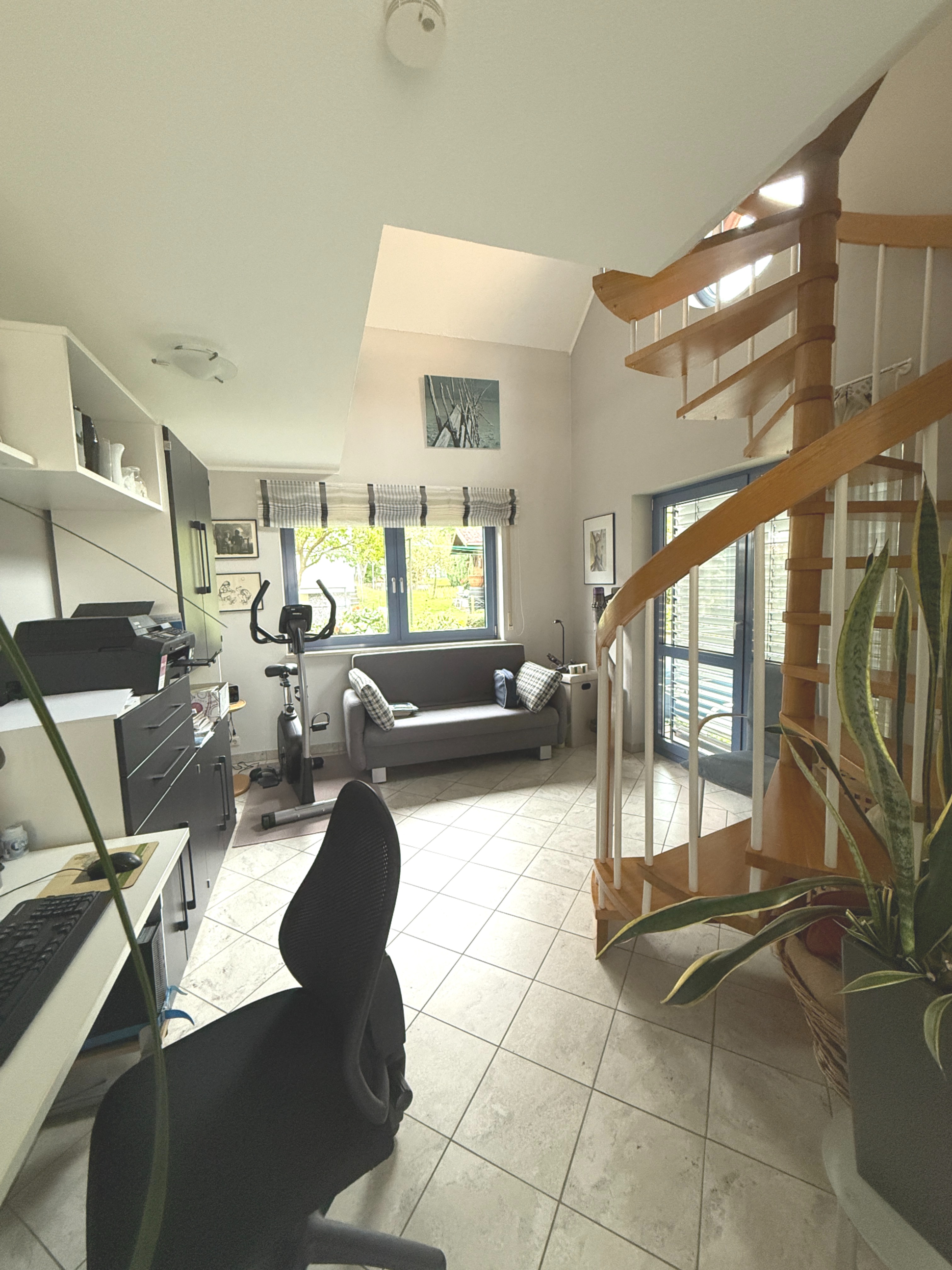 Diese Räumlichkeiten wären: separates Esszimmer, separate Küche (Einbauküche ist im Mietumfang enthalten), Hauswirtschaftsraum mit Anschluss für Waschmaschine/Trockner, Gäste-WC sowie das Wohnzimmer. Das Wohnzimmer geht über in den Wintergarten. Von dort gelangen Sie über eine attraktive Wendeltreppe nach oben in das Galeriezimmer, welches sich ideal als Arbeits- oder Gästezimmer eignet.