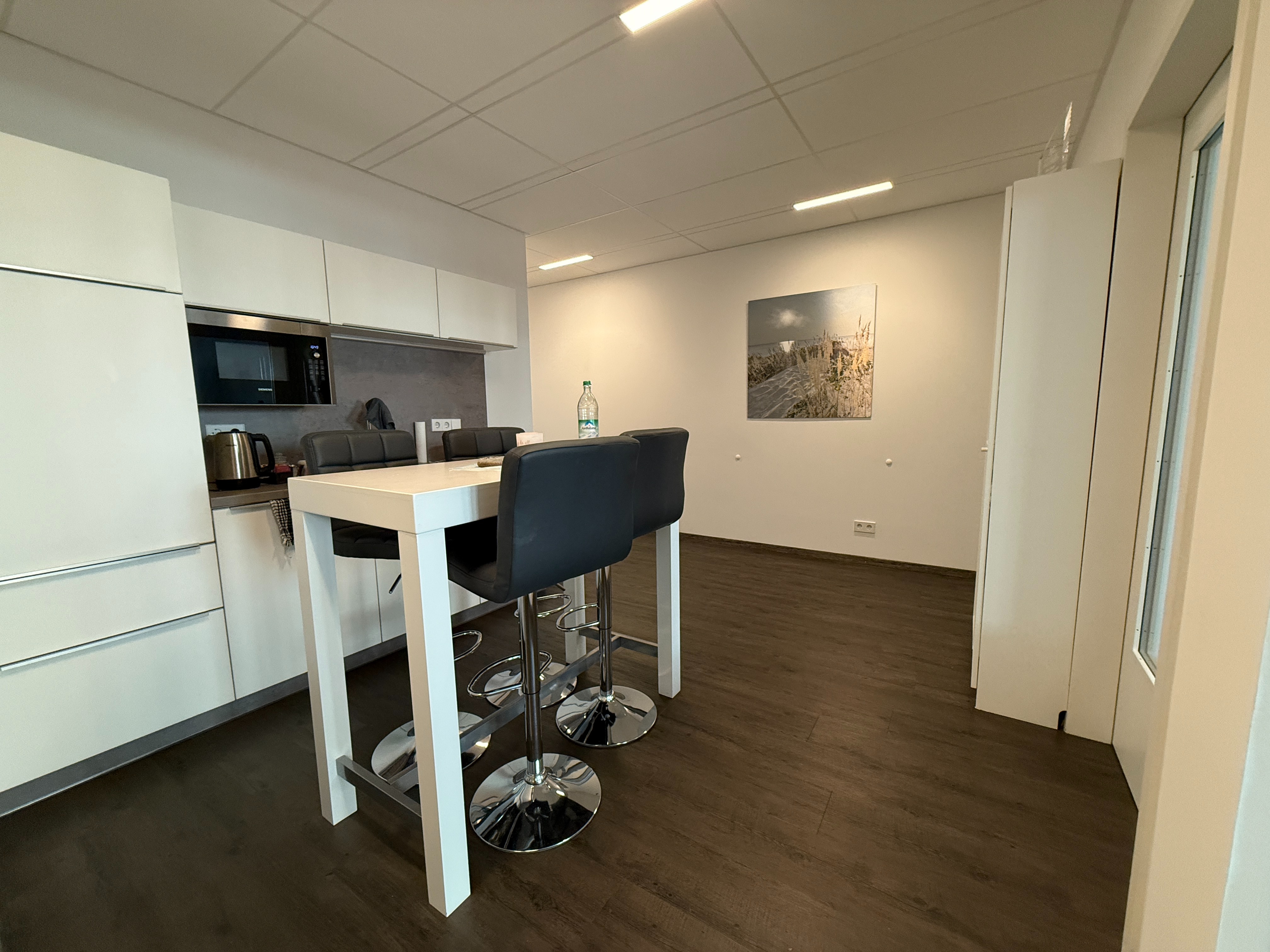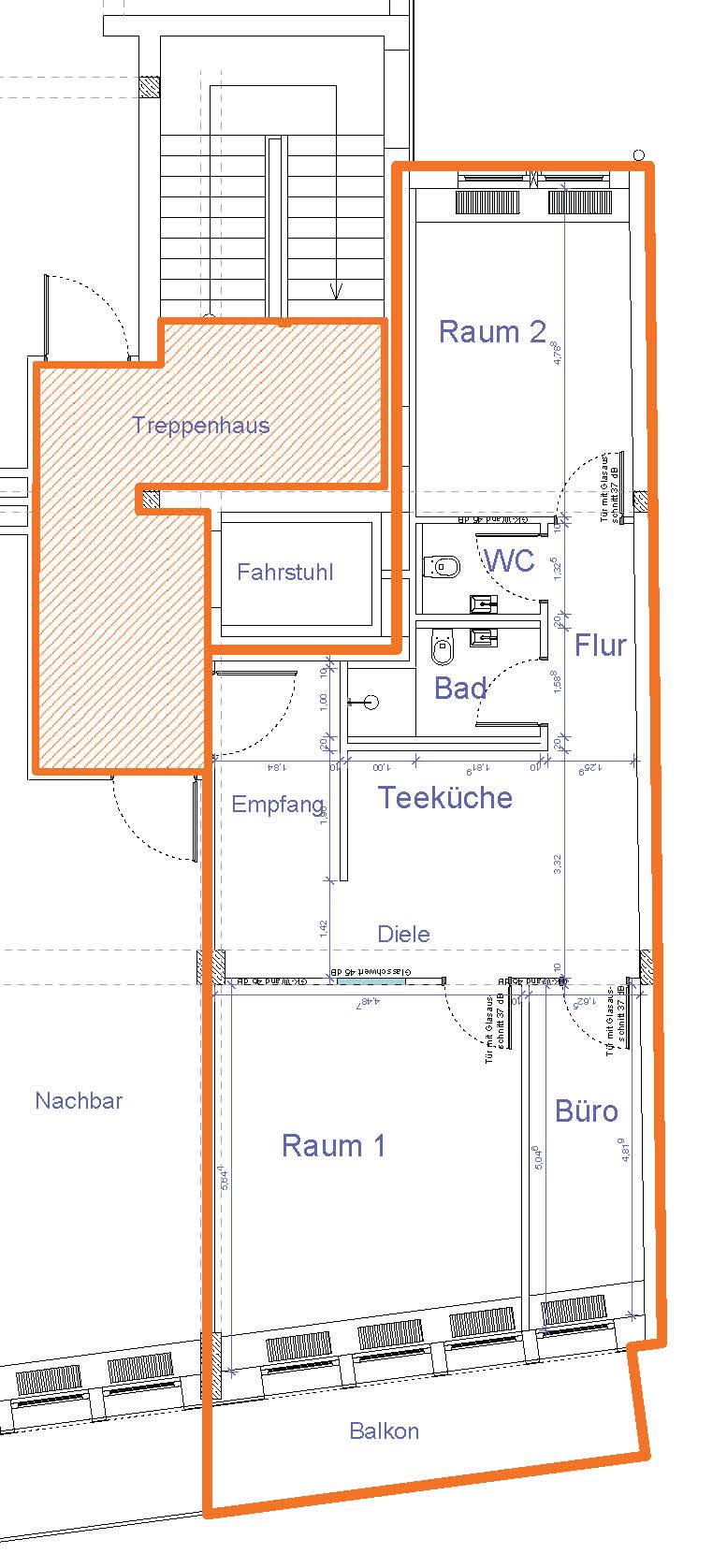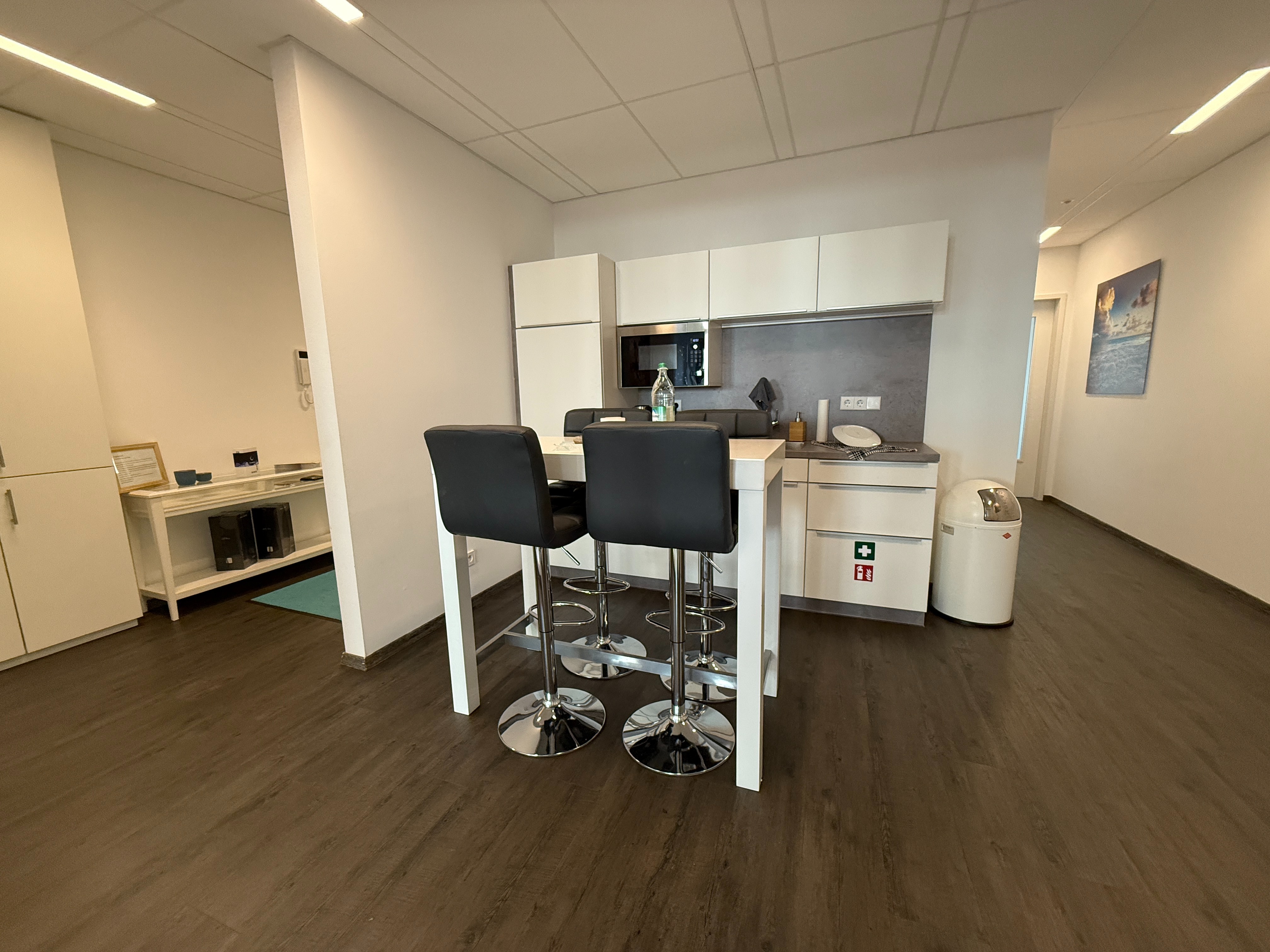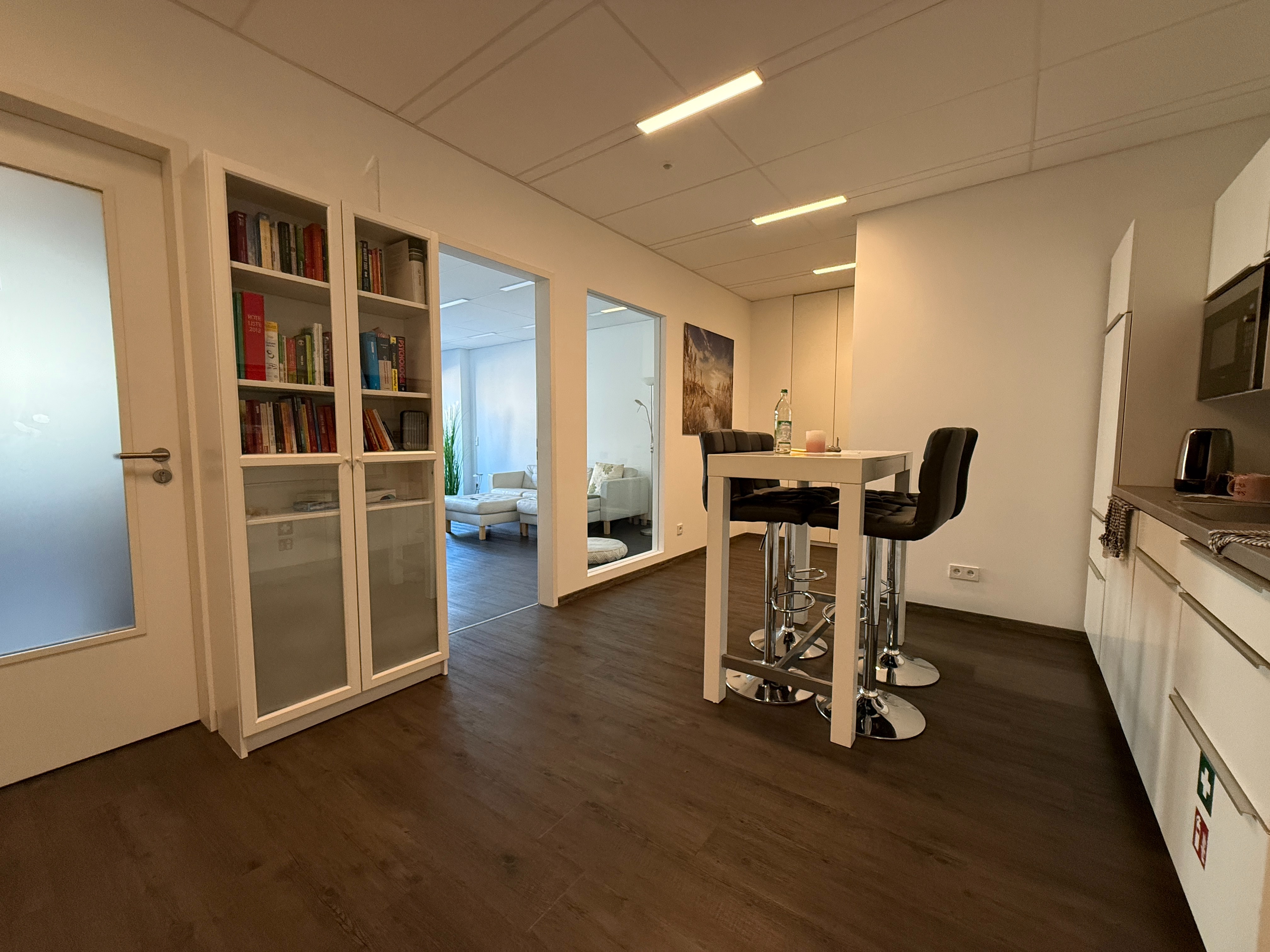 Die Fläche teilt sich auf in einem großzügigen Flur- und Dielelbereich mit offener Teeküche und Platz für einen Wartebereich bei Bedarf für Patienten. Des Weiteren stehen Ihnen zwei große Büro- bzw. Behandlungsräume sowie ein kleinerer Büroraum zur Verfügung. Der große Raum und das kleine Büro haben jeweils Zugang zum dazugehörigen Balkon.