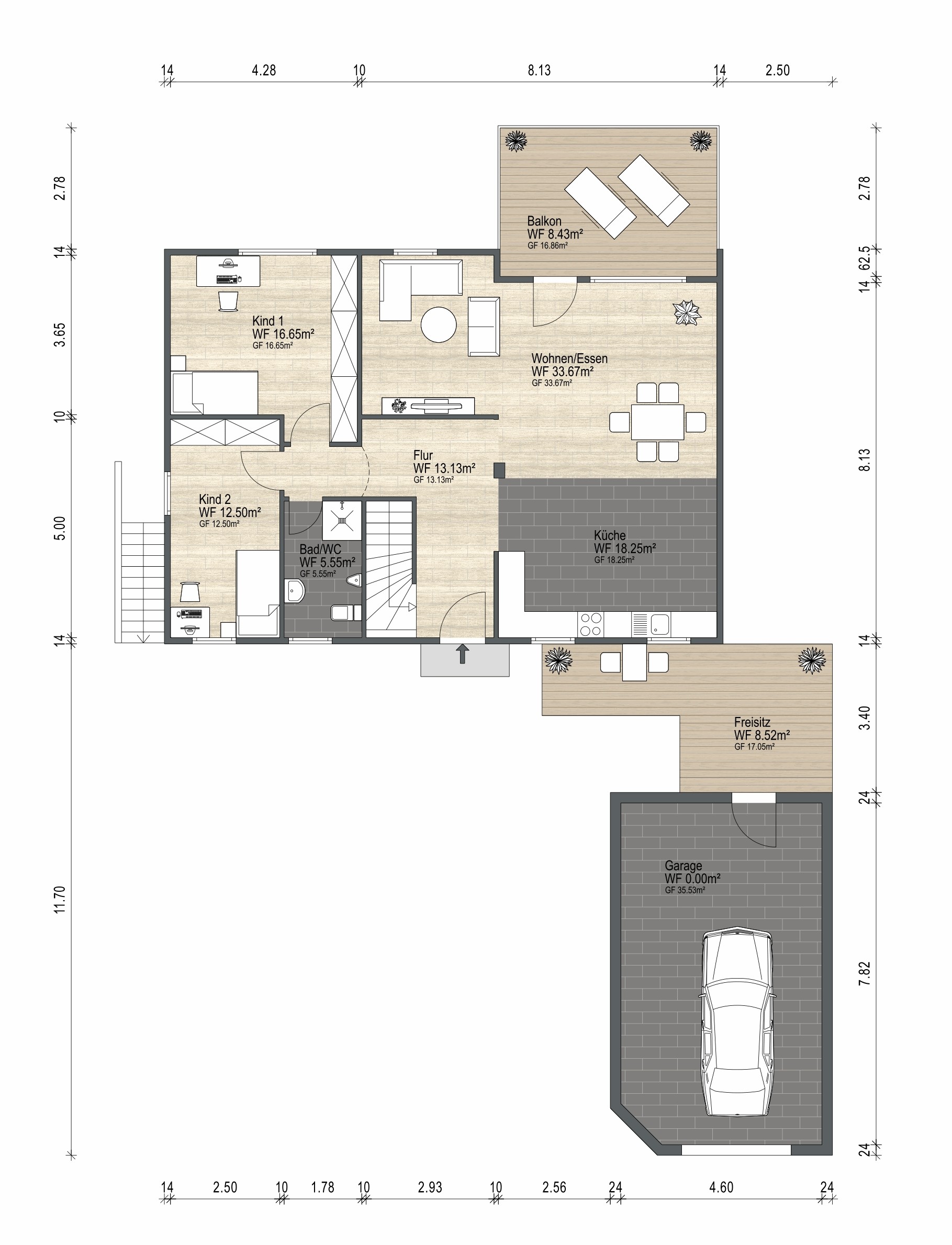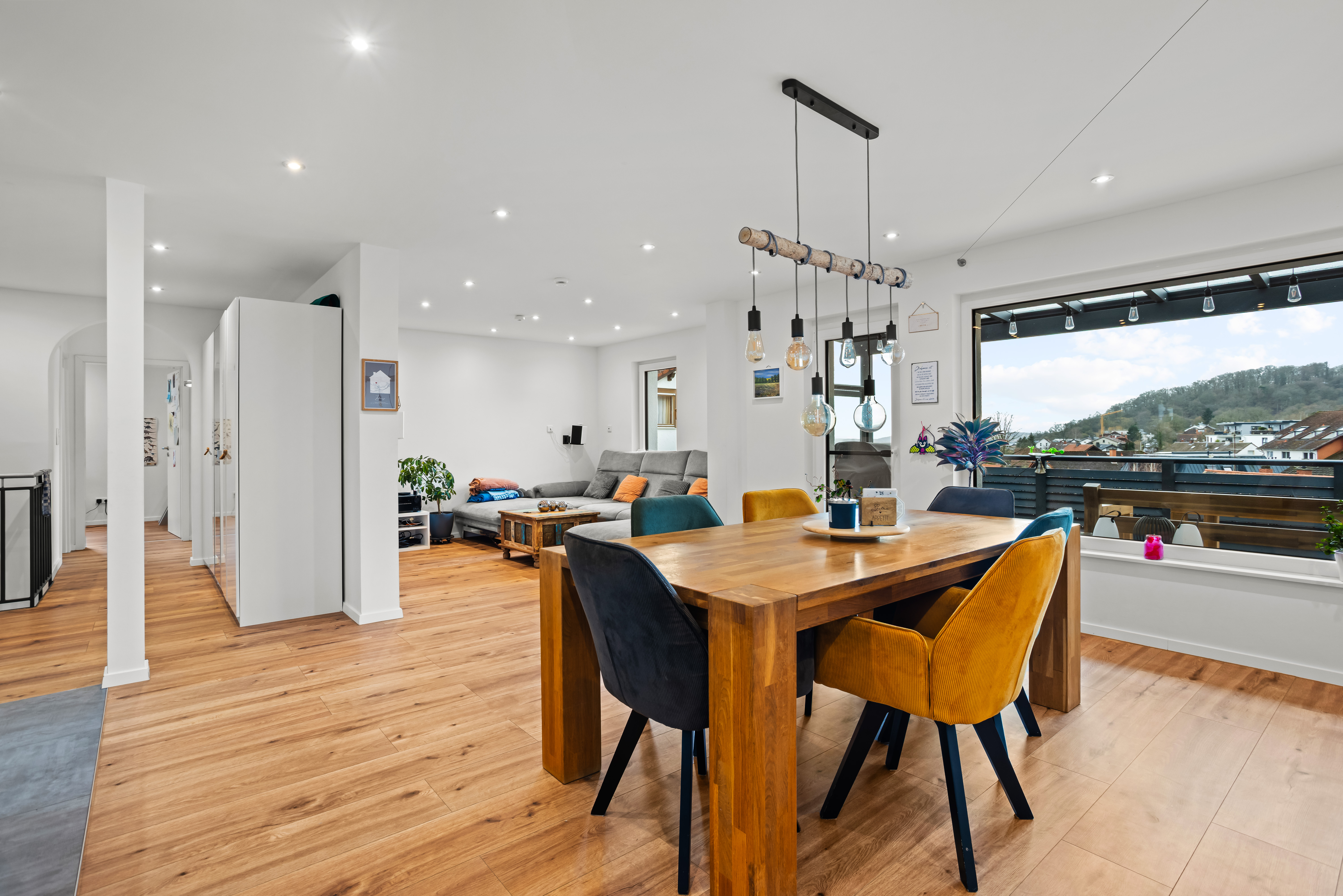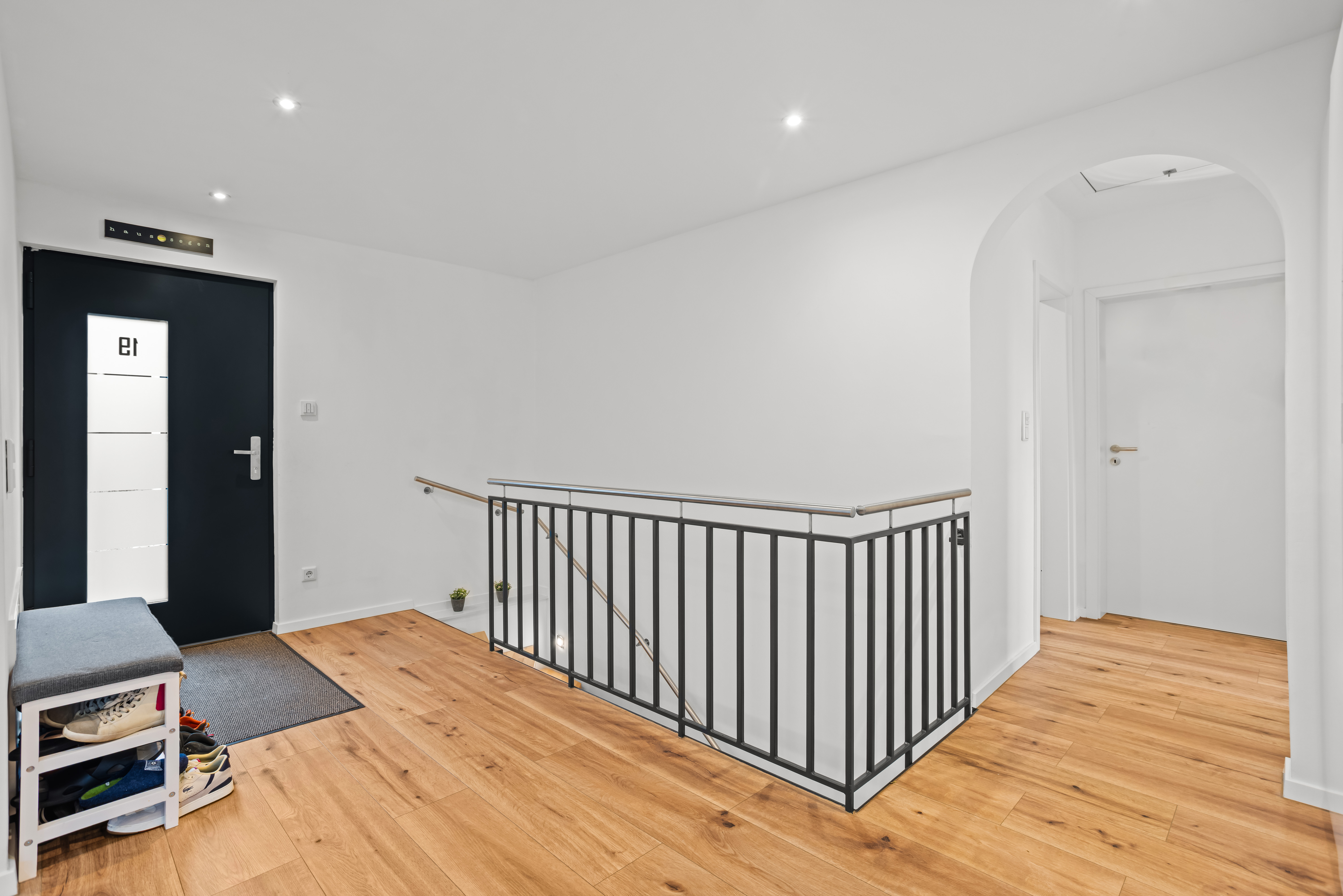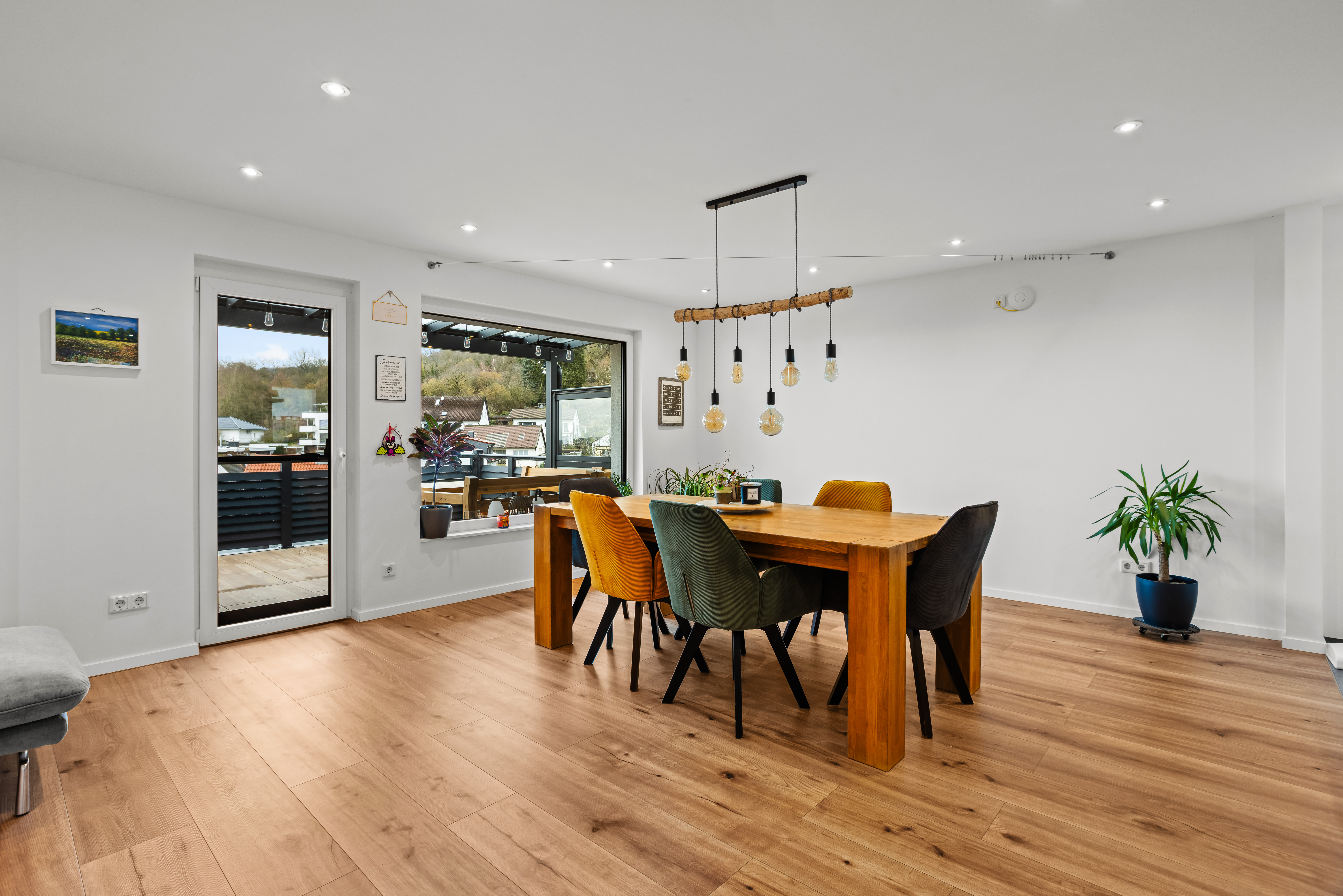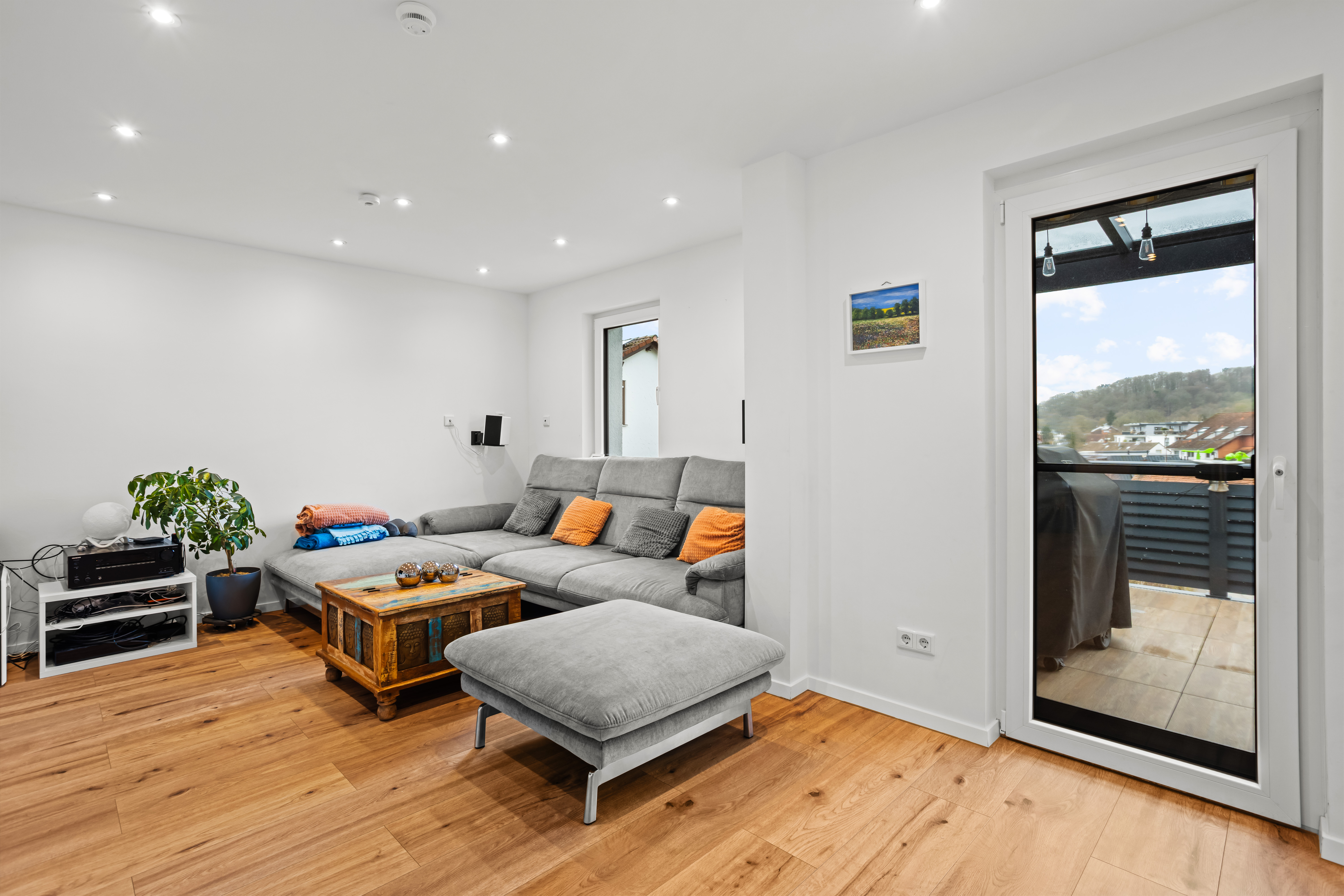 Der nahezu stufenlose Eingang führt Sie ins Erdgeschoss, wo ein einladender, großzügiger Eingangsbereich in den offen gestalteten Wohn- und Essbereich sowie die angrenzende Küche übergeht. Der Wohnbereich ist halboffen gehalten und eignet sich ideal als gemütliche Fernsehecke. Vom Essbereich aus gelangen Sie auf den Süd-West-Balkon, der einen herrlichen Ausblick bietet.