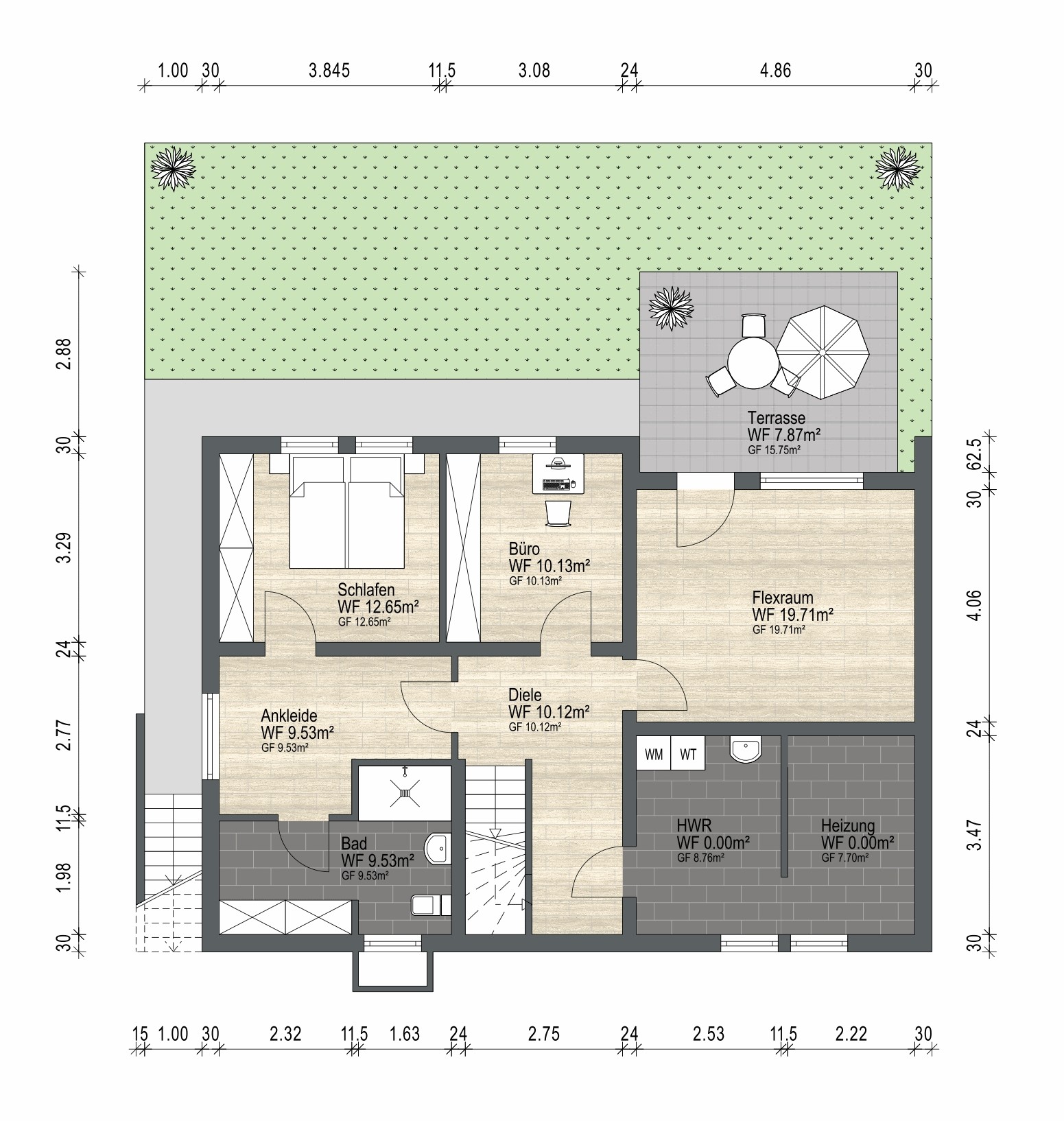 Über eine elegante Treppe mit Echtholzbelag erreichen Sie das nahezu vollständig ausgebaute Untergeschoss. Hier erwartet Sie ein durchdachter Grundriss mit einem großzügigen Flurbereich, einem separaten Elternbereich bestehend aus Schlafzimmer, Ankleide und hochwertigem Masterbad. Zusätzlich stehen Ihnen ein separates Büro sowie ein Wohn- bzw. Schlafraum mit Zugang zur Terrasse und zum Garten zur Verfügung. Dank der Hanglage ist auch dieses Geschoss angenehm hell und lichtdurchflutet. Im hinteren Bereich befinden sich der Technik- und Heizungsraum sowie ein Hauswirtschaftsraum mit Anschlüssen für Waschmaschine und Trockner.