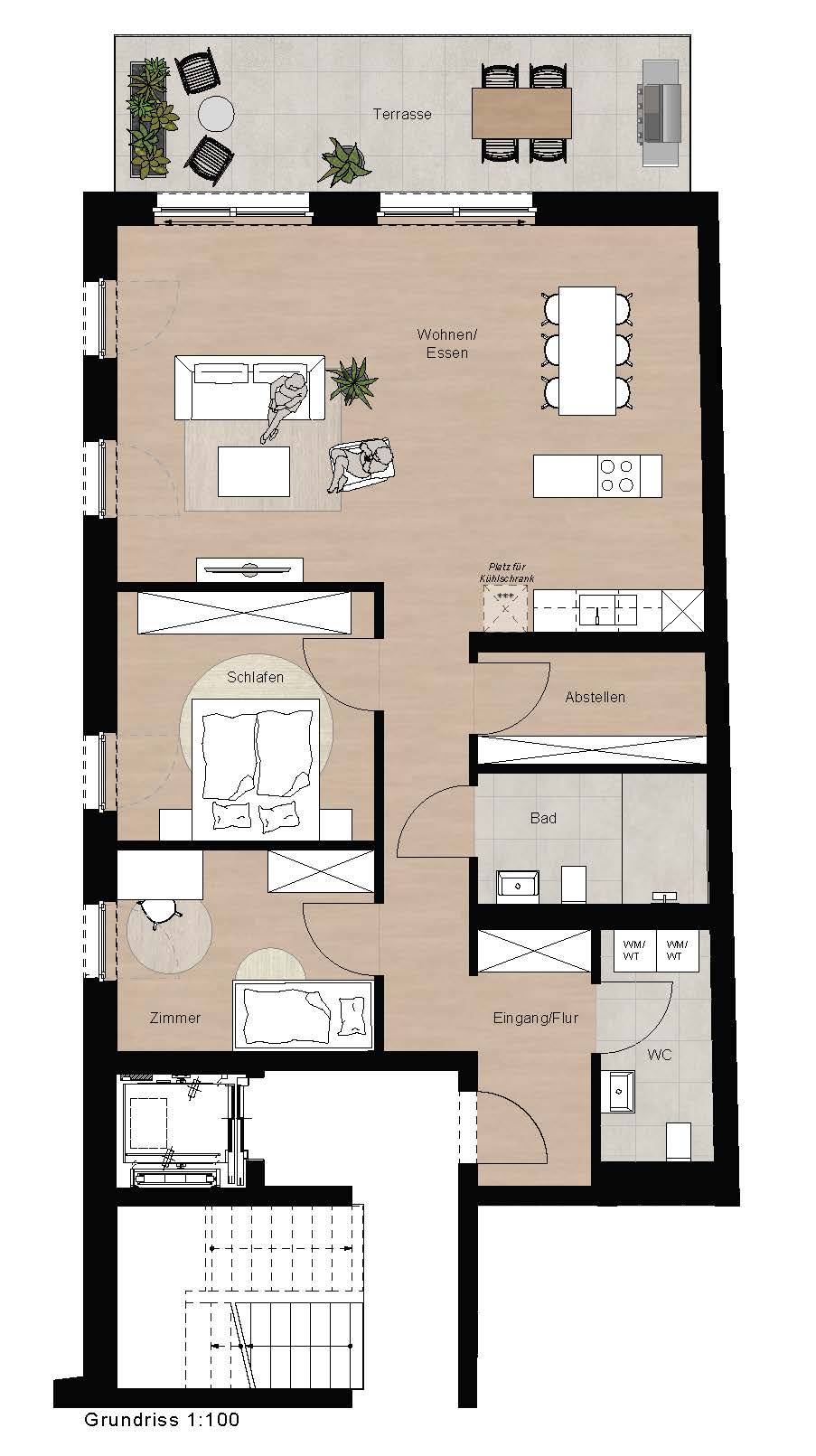 Die Wohnung verfügt über zwei Schlafräume, ein Badezimmer mit begehbarer Dusche, ein Gäste-WC mit Anschluss für Waschmaschine und Trockner, ein Abstellraum sowie einen offenen Wohn- und Essbereich mit Zugang zur großen Terrasse mit Blick in Richtung Kinzig/Müllerwiese.