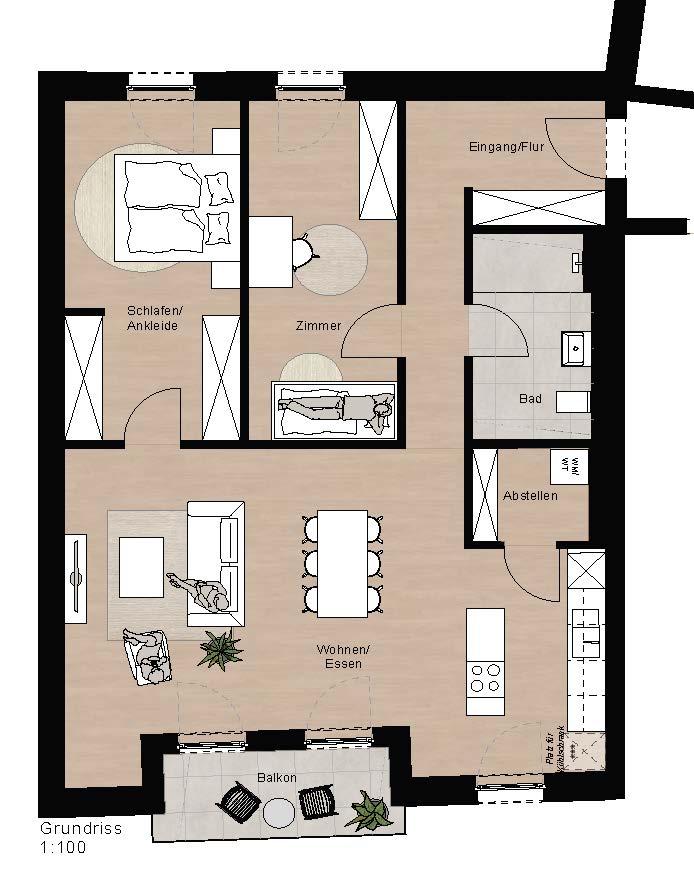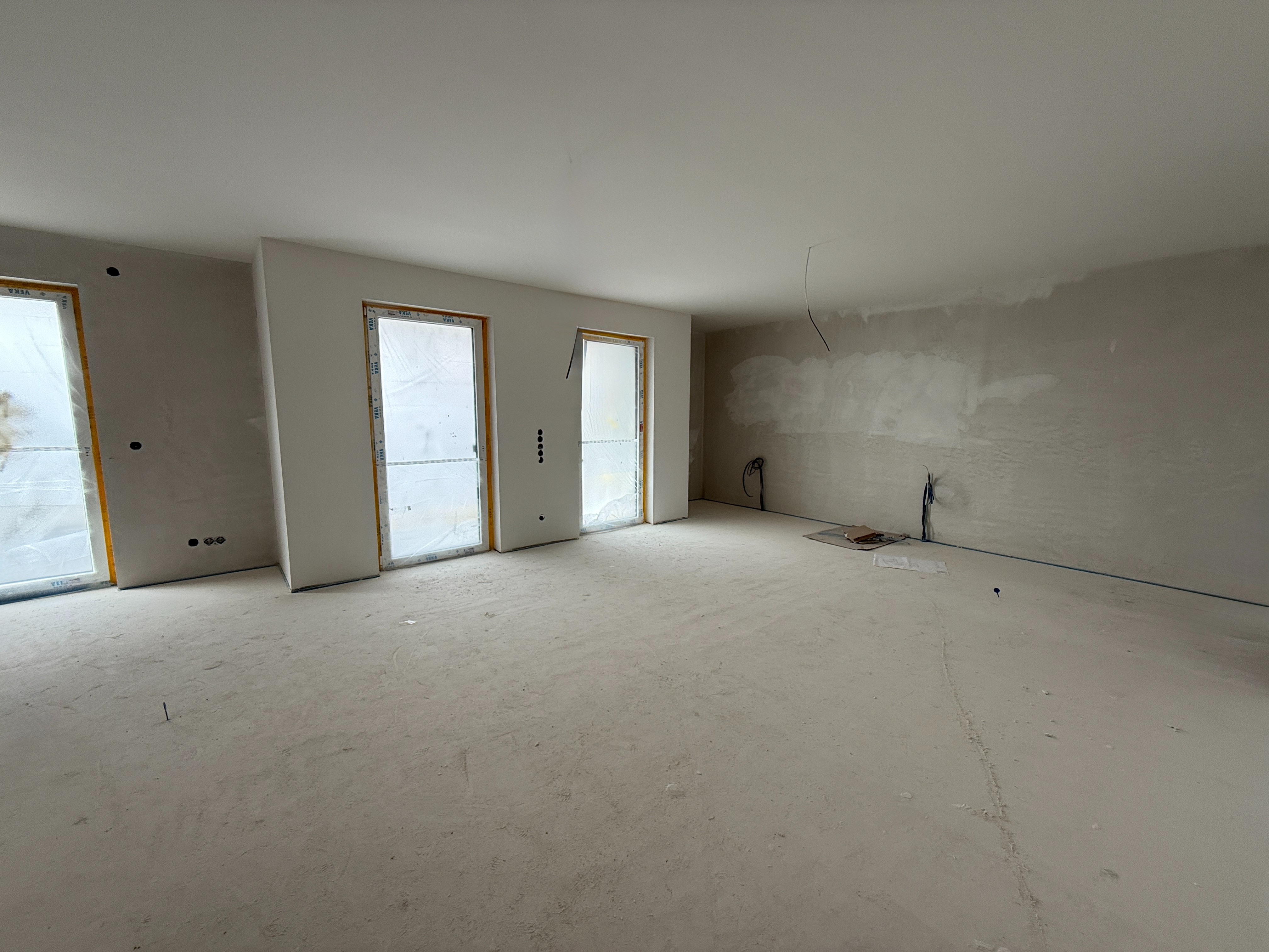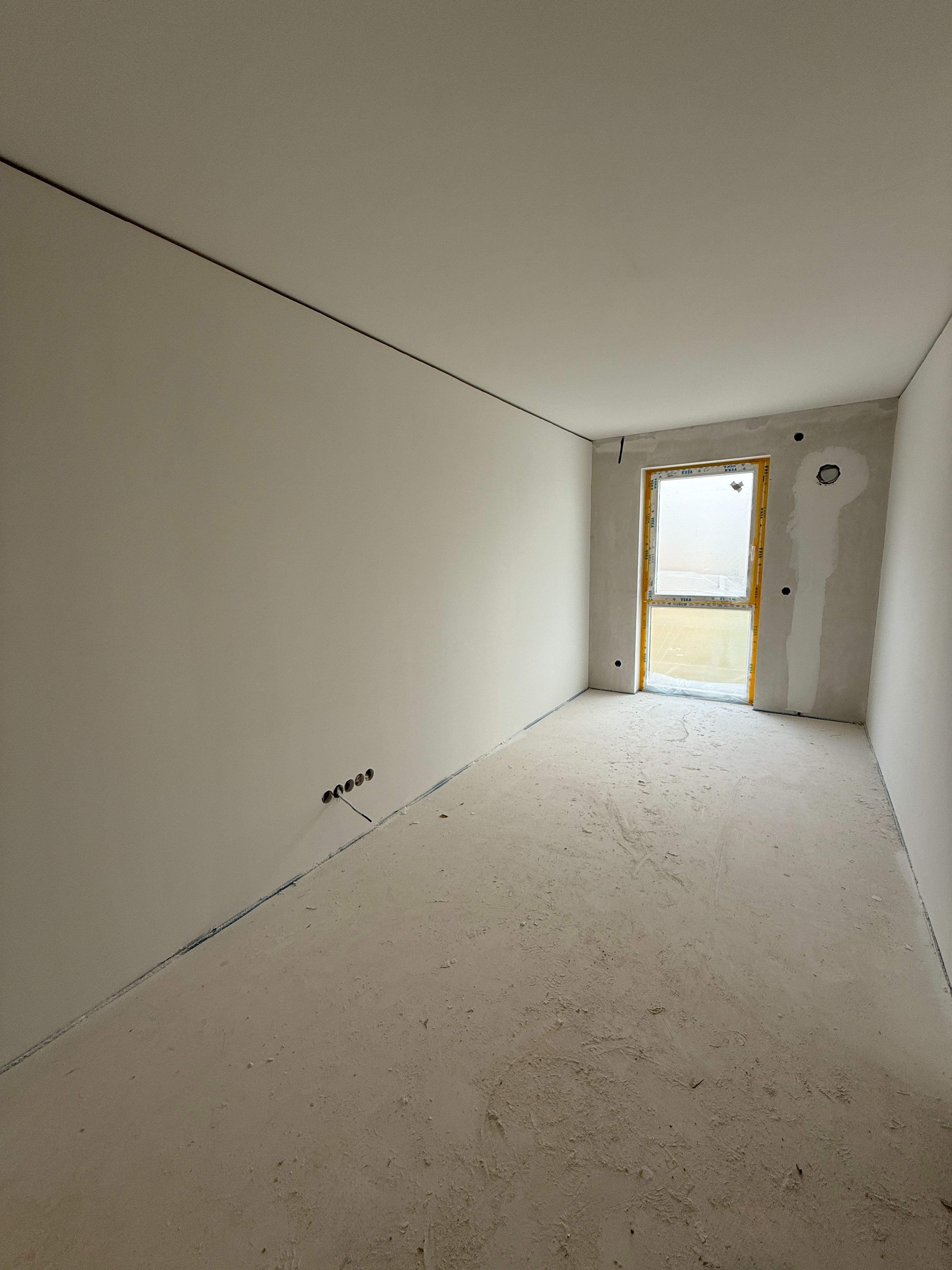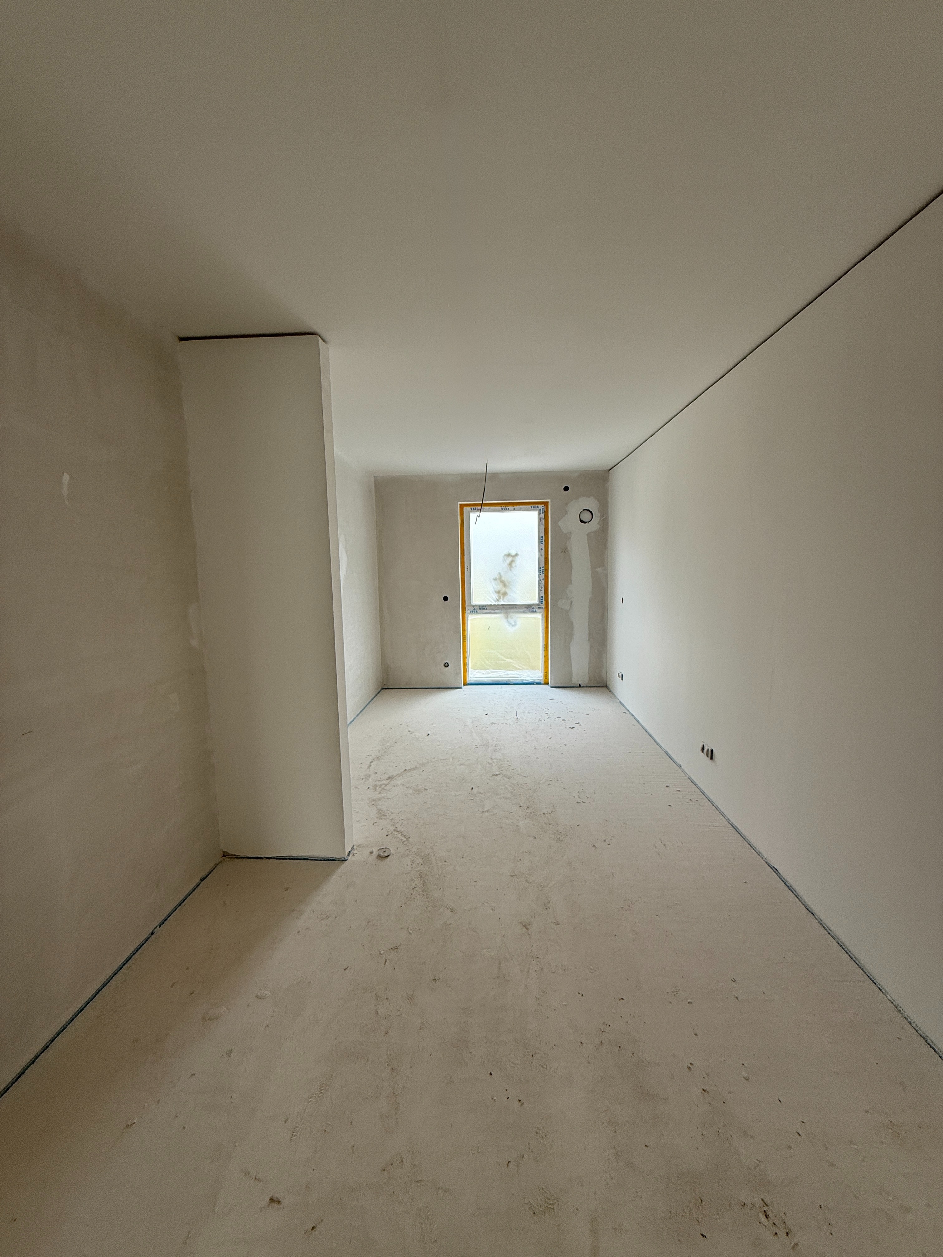 Die Wohnung verfügt über zwei Schlafräume, ein Badezimmer mit begehbarer Dusche, einen offenen Wohn- und Essbereich mit Abstellraum sowie über eine überdachte Loggia. Der Abstellraum bietet Platz für den Anschluss von Waschmaschine und Trockner.