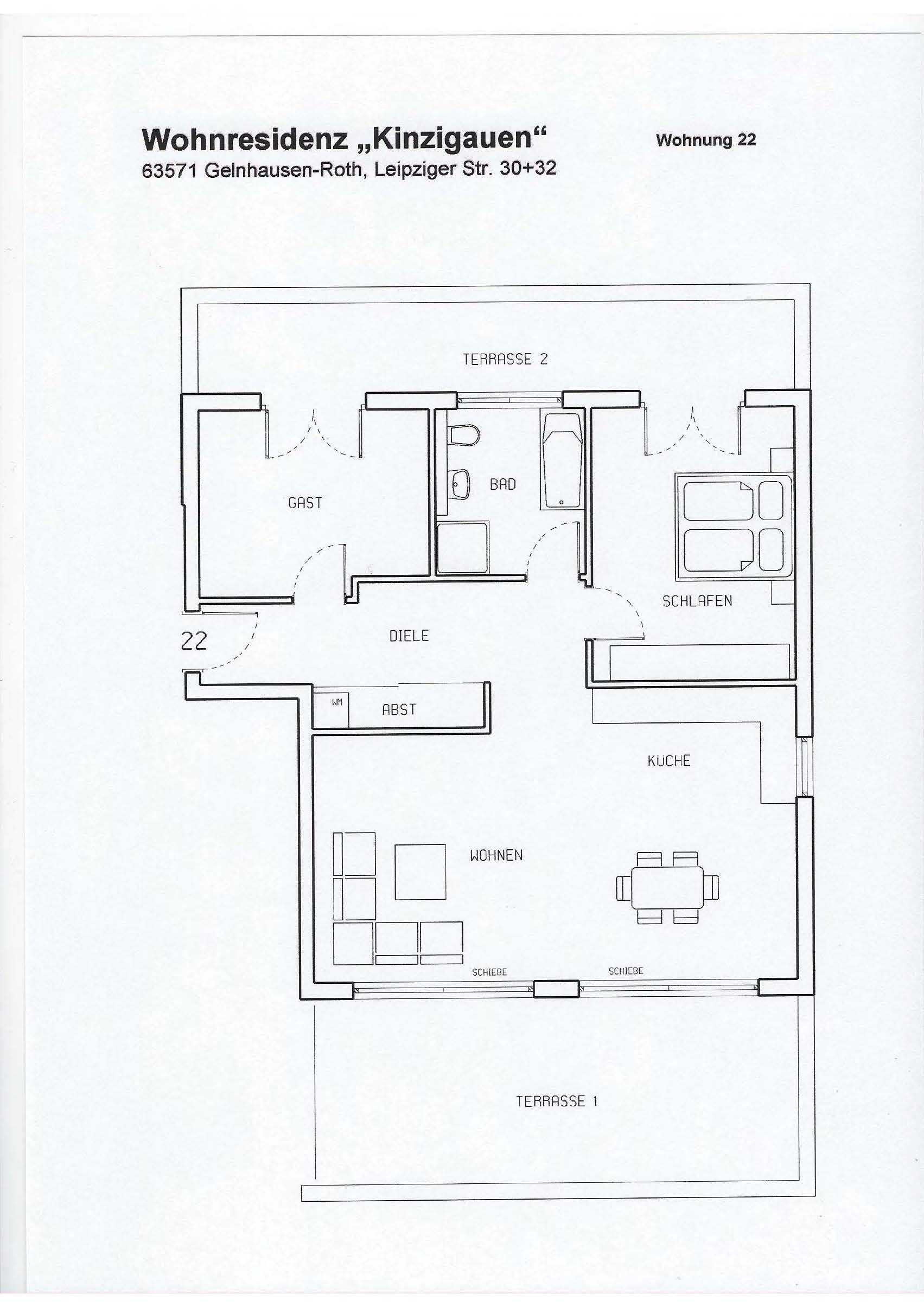 Bitte beachten, dass entgegen dem Grundrissplan die Wohnung nur über eine große begehbare Dusche im Badezimmer verfügt und nicht über eine Badewanne!
