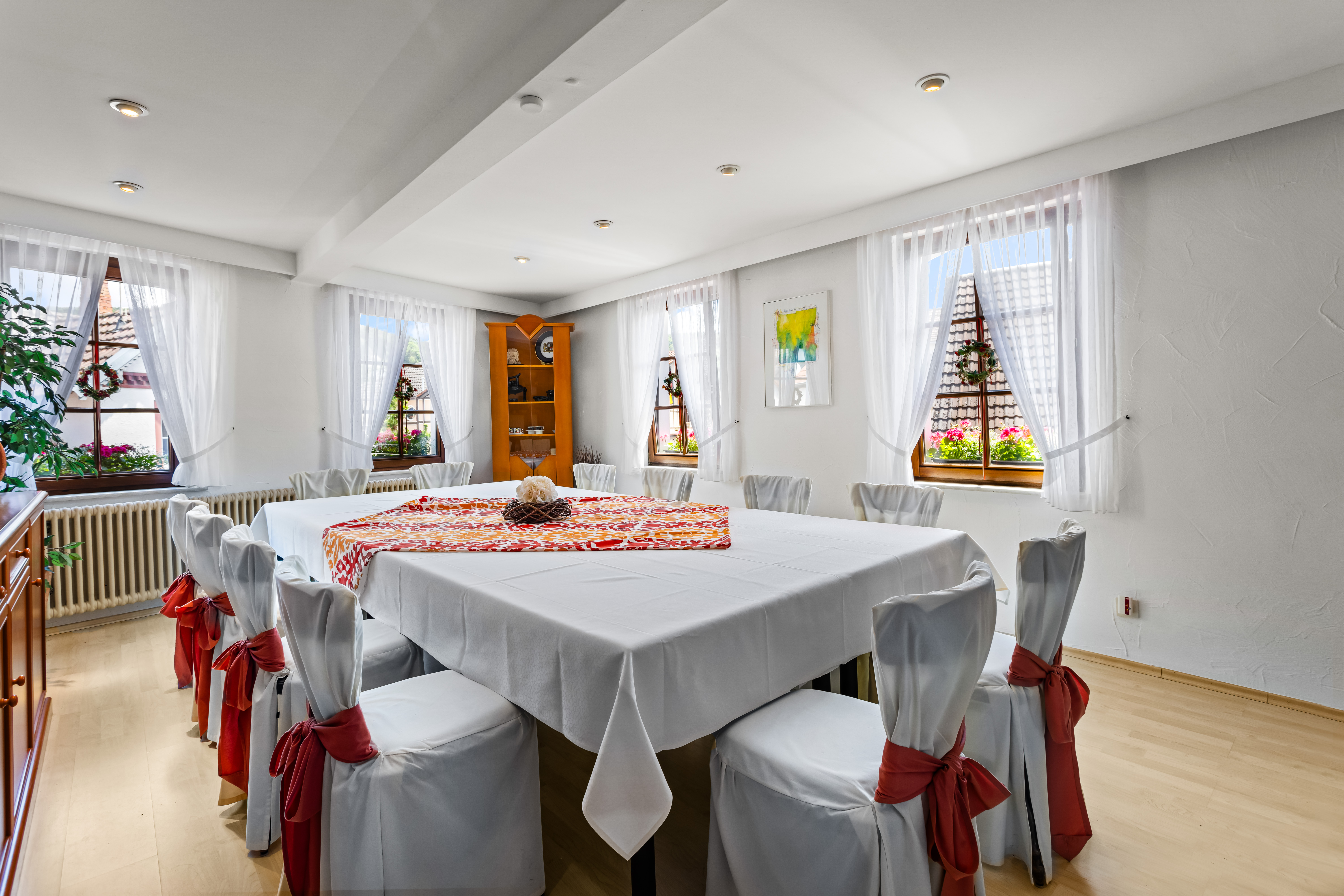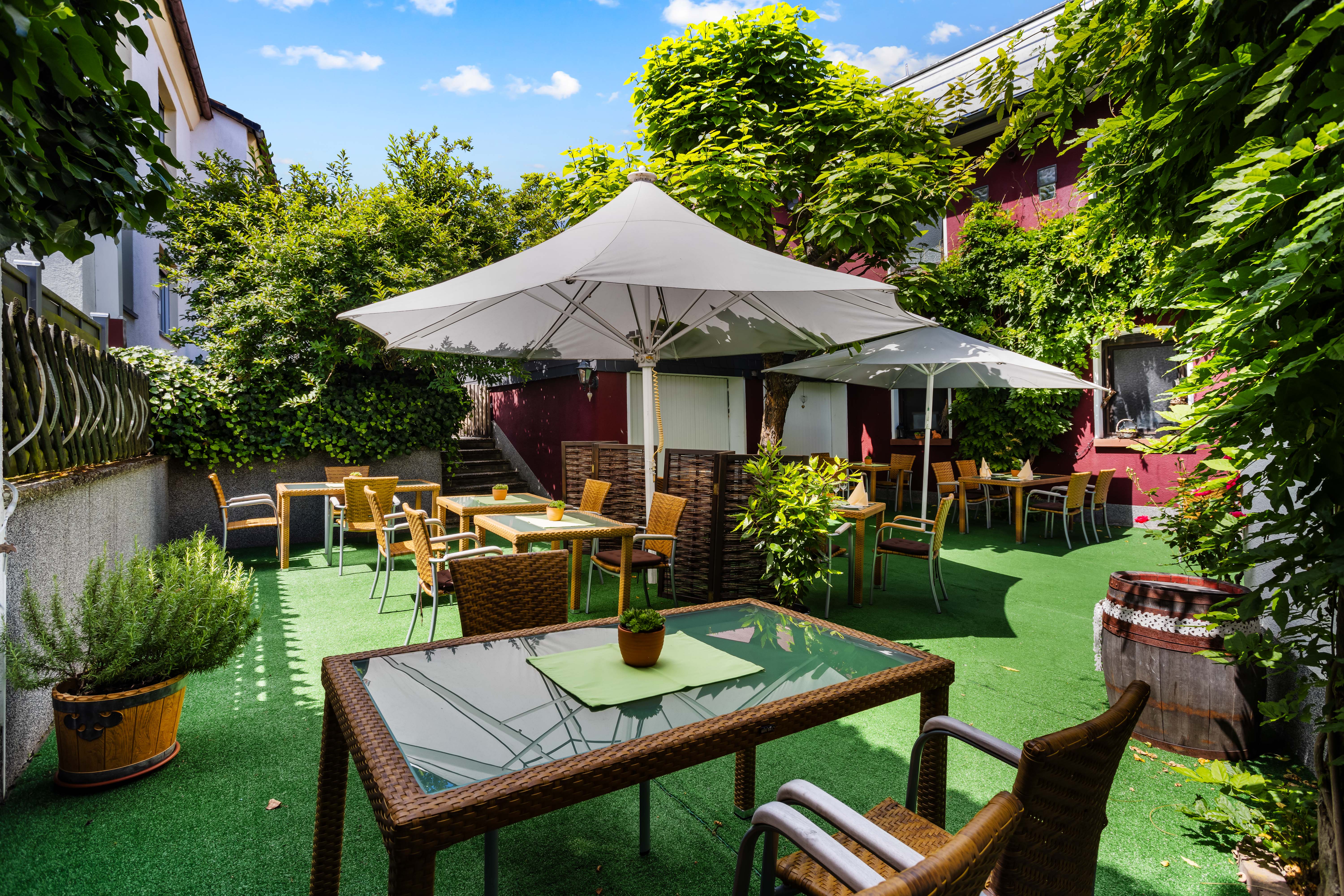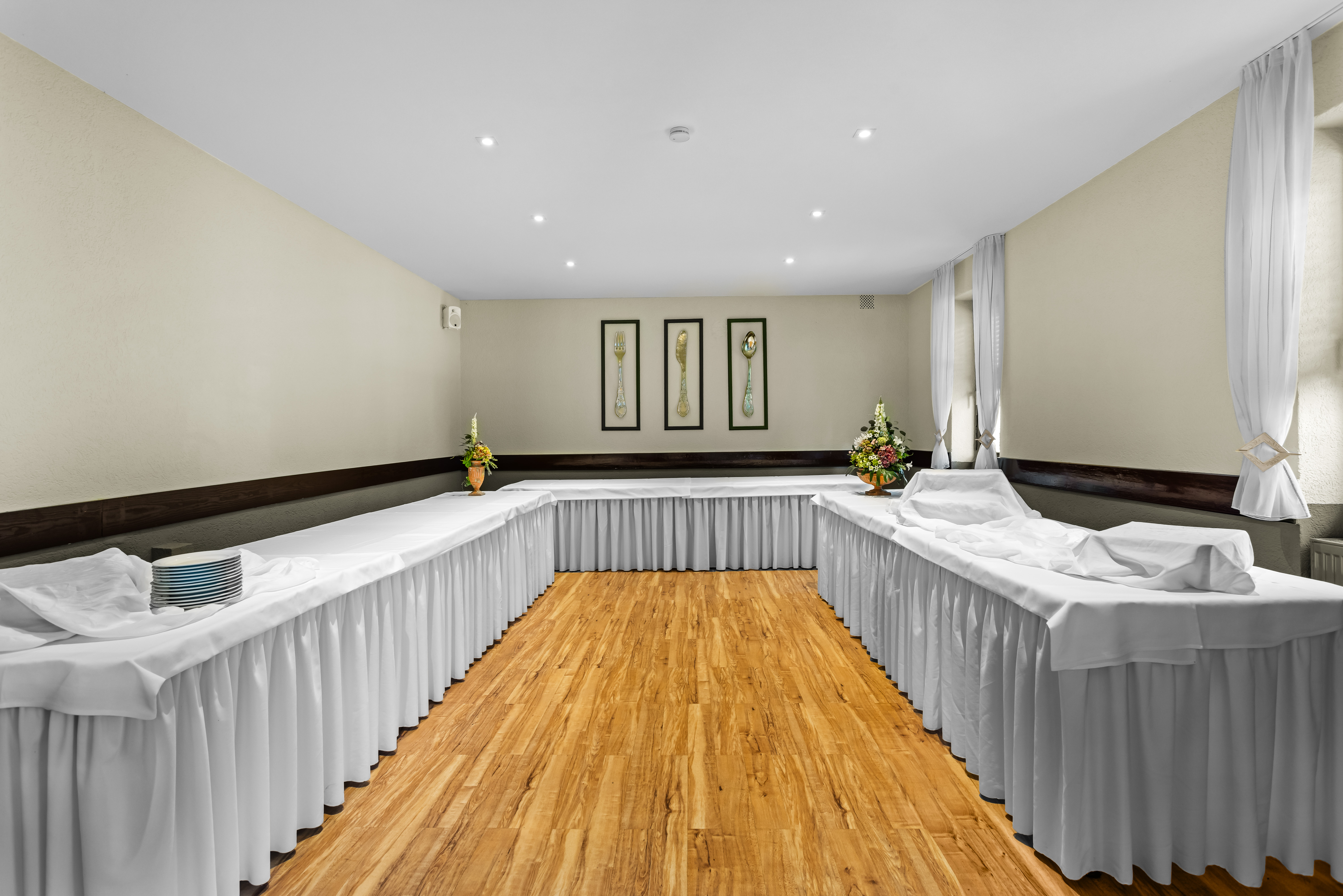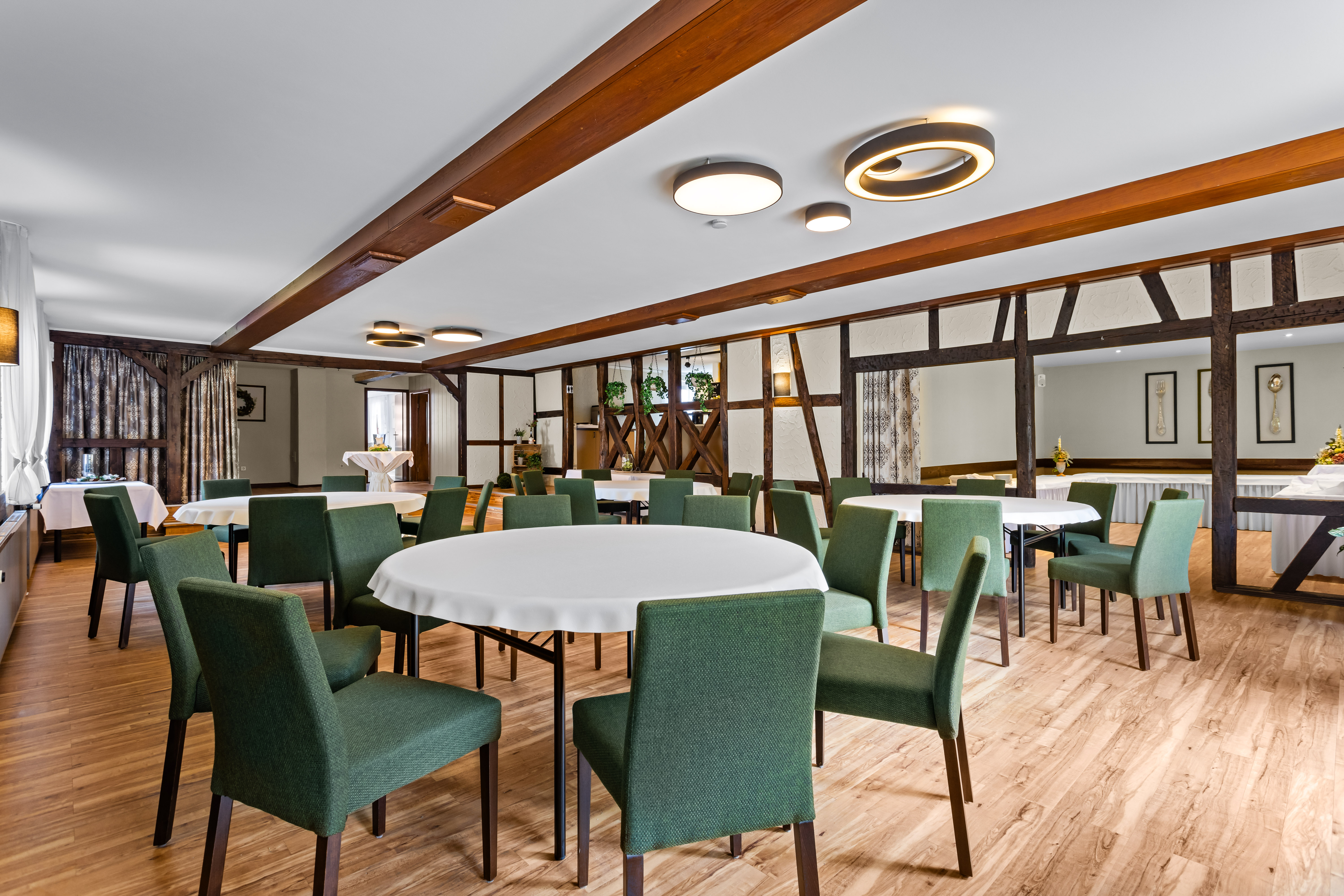 Im Gastraum im Erdgeschoss können bis zu 60 Gäste untergebracht werden, im 1. Obergeschoss 70 Gäste und im Außenbereich Terrasse + Biergarten ebenfalls bis maximal 70 Gäste.