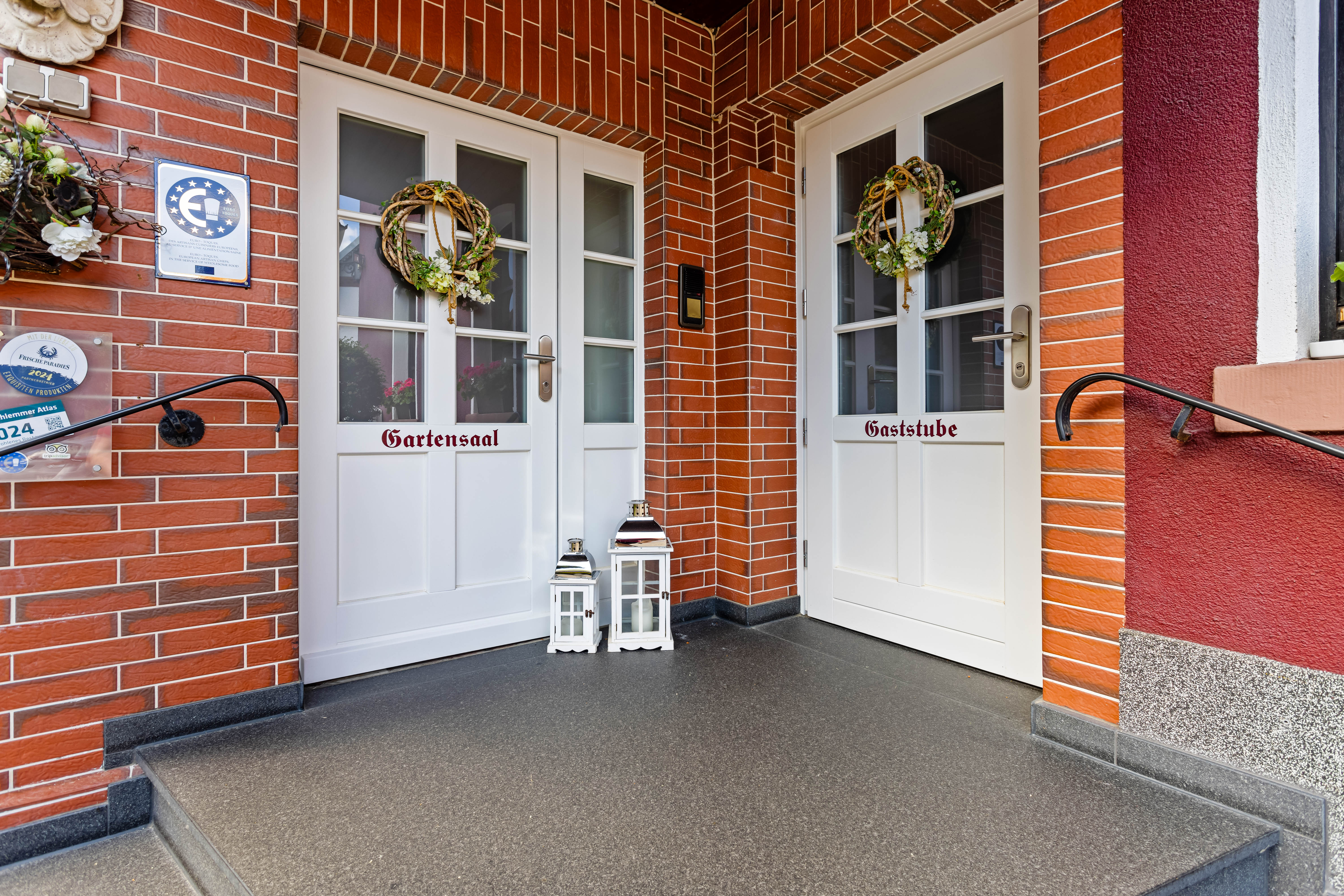 Der Gebäudekomplex besteht zwei Gebäuden inklusive Garagen, Hof- und Freiflächen. Das Haupthaus beherbergt im Erdgeschoss die Gasträume mit WC-Bereich und direkt angrenzender Küche mit Kühl- und Lagerräumen.